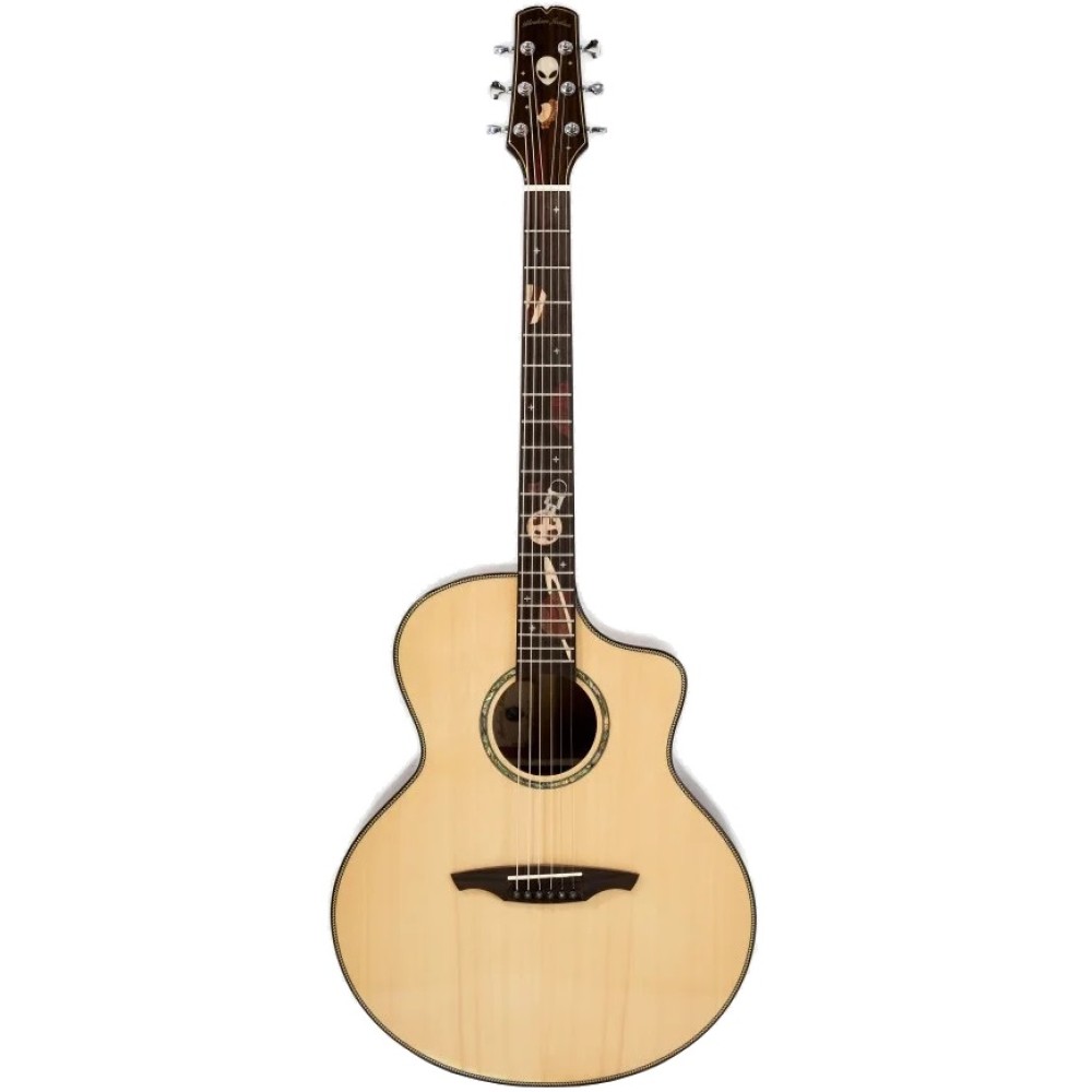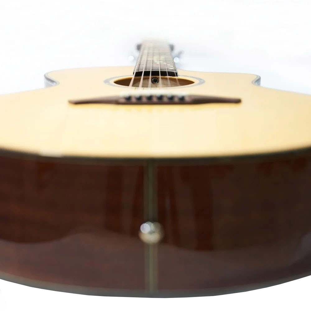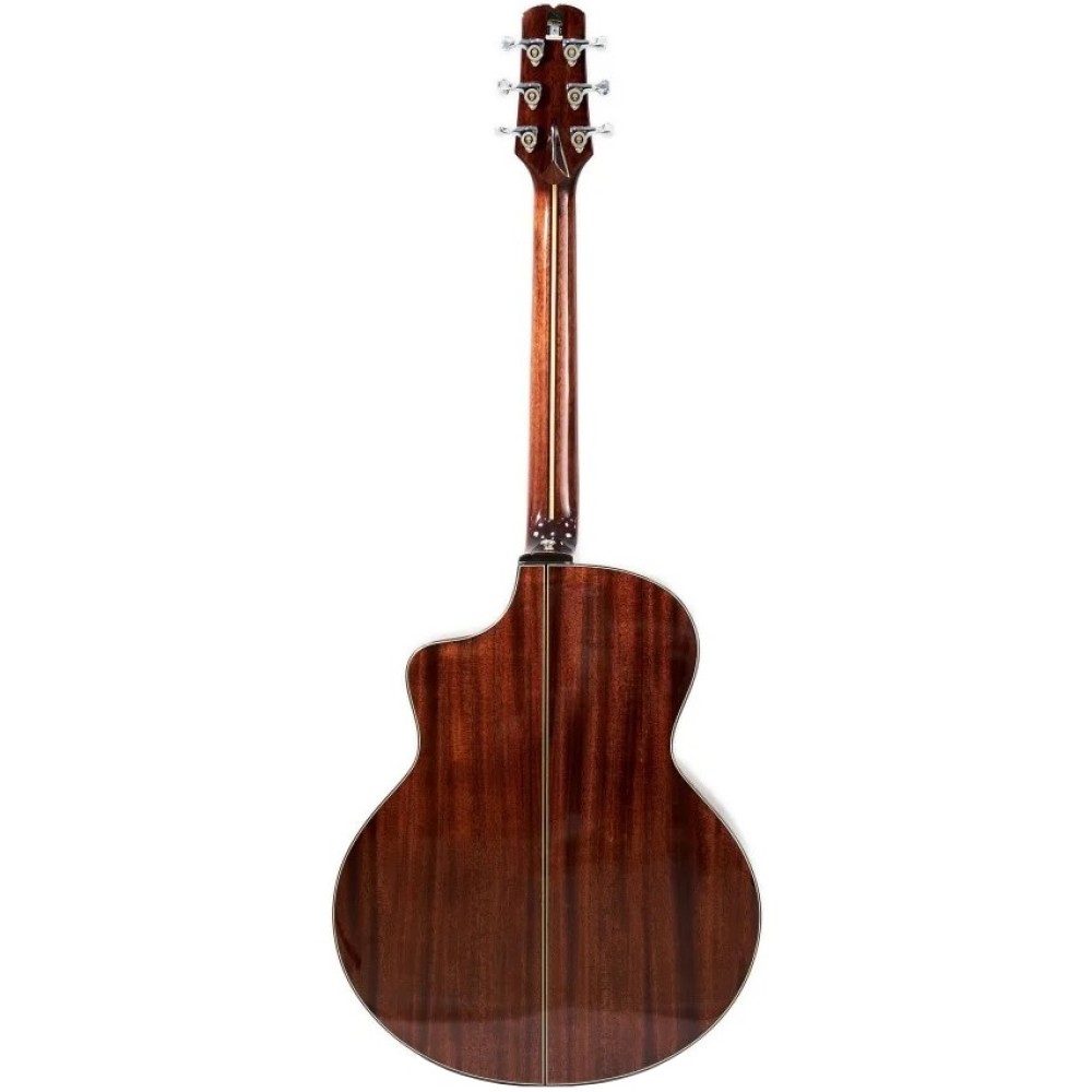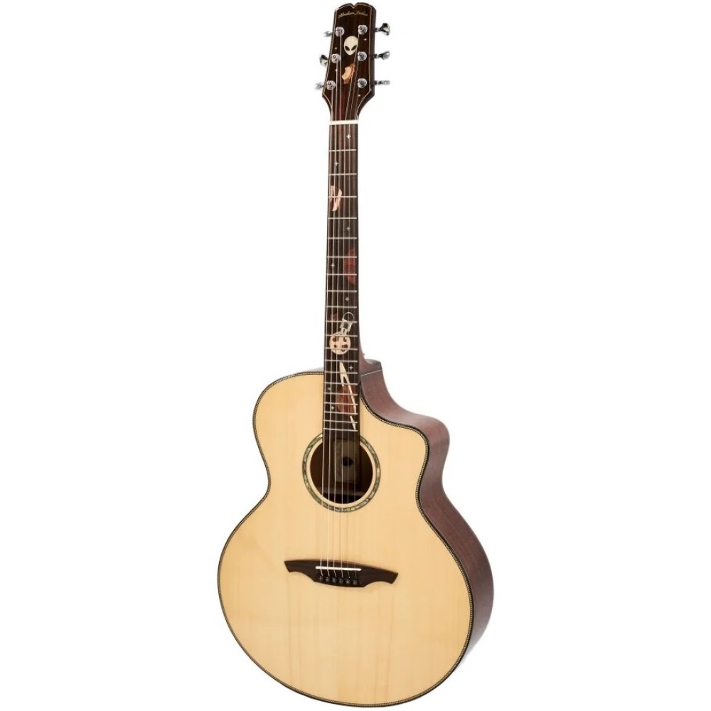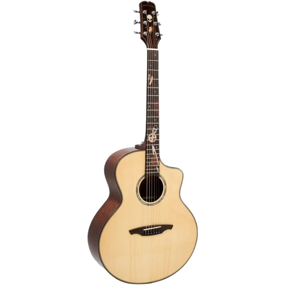 Верхняя дека выполнена из массива канадской ели класса AA, что обеспечивает яркое, чистое звучание с отличной проекцией. Нижняя дека и обечайки из шпона африканского красного дерева придают тембру теплоту и насыщенность. Благодаря вырезу Cut-away удобно играть в верхнем регистре на верхних ладах, а глянцевое покрытие подчёркивает натуральную красоту древесины.
